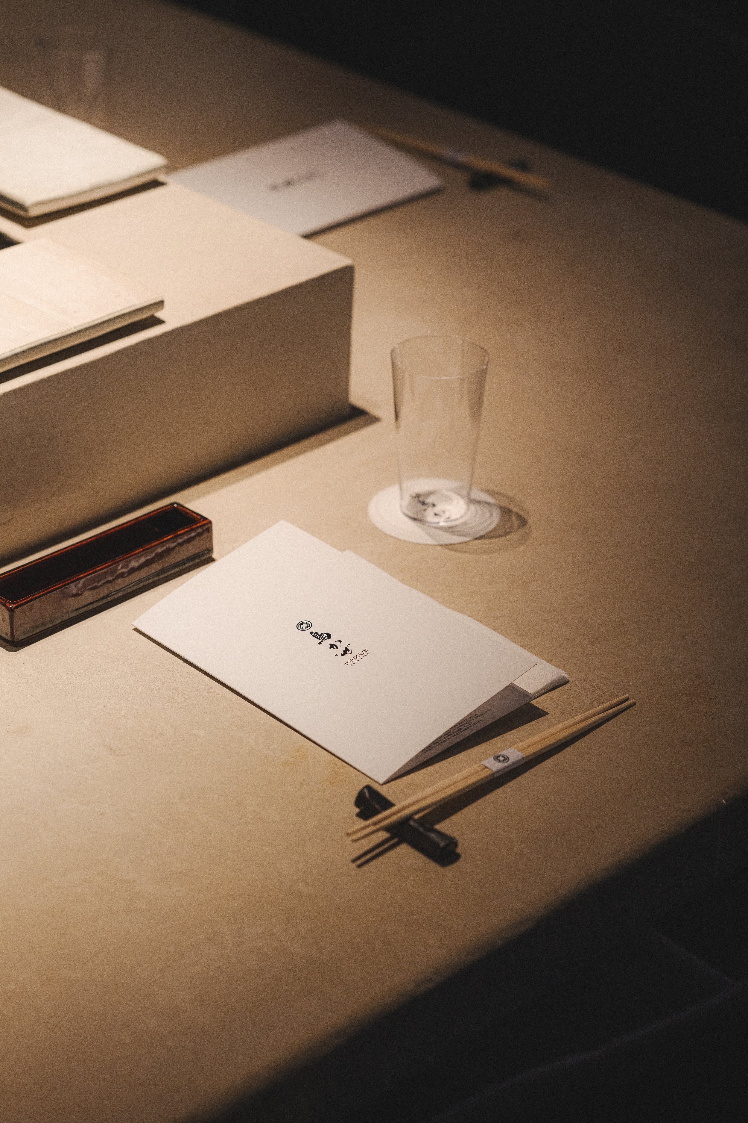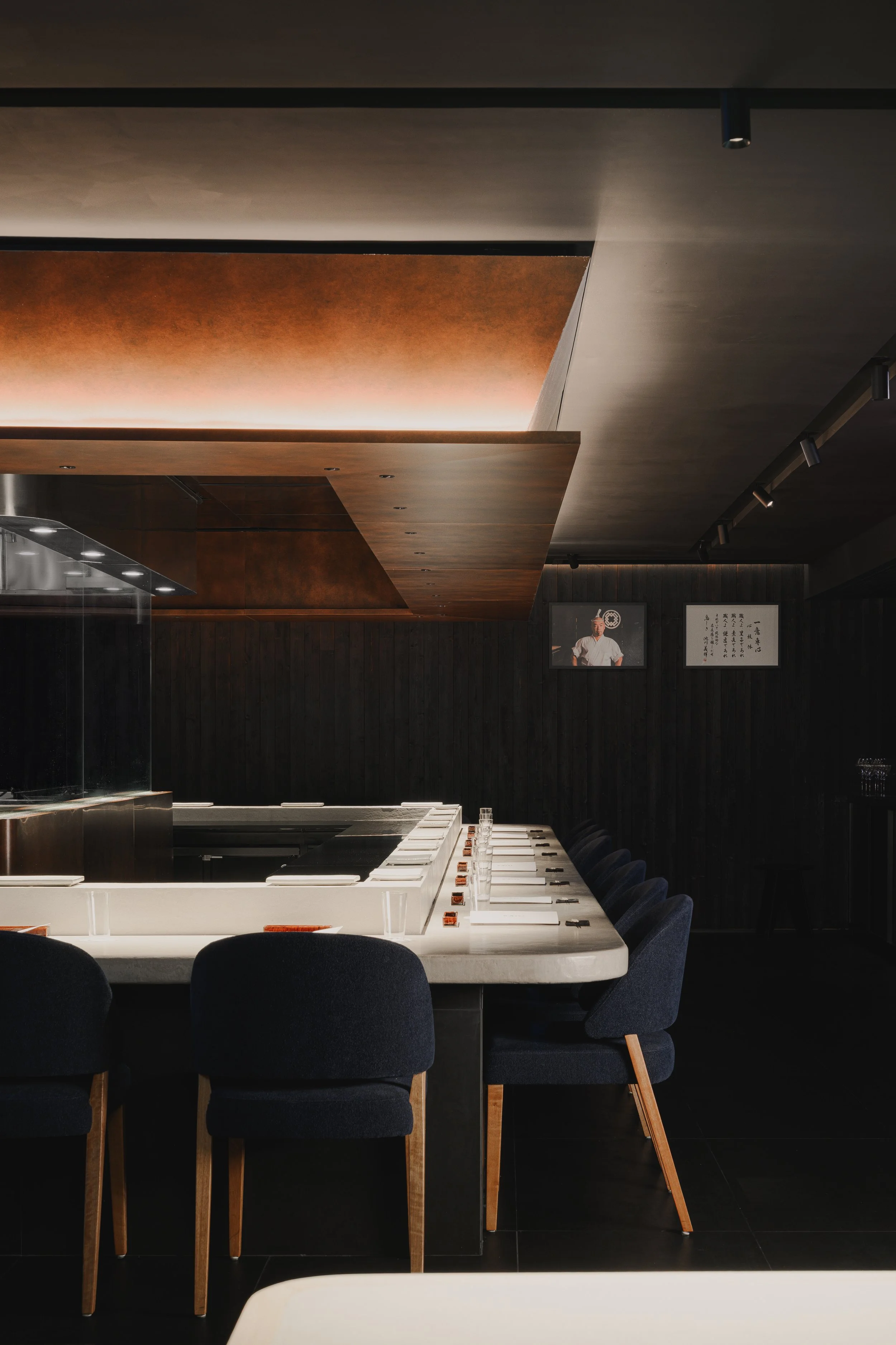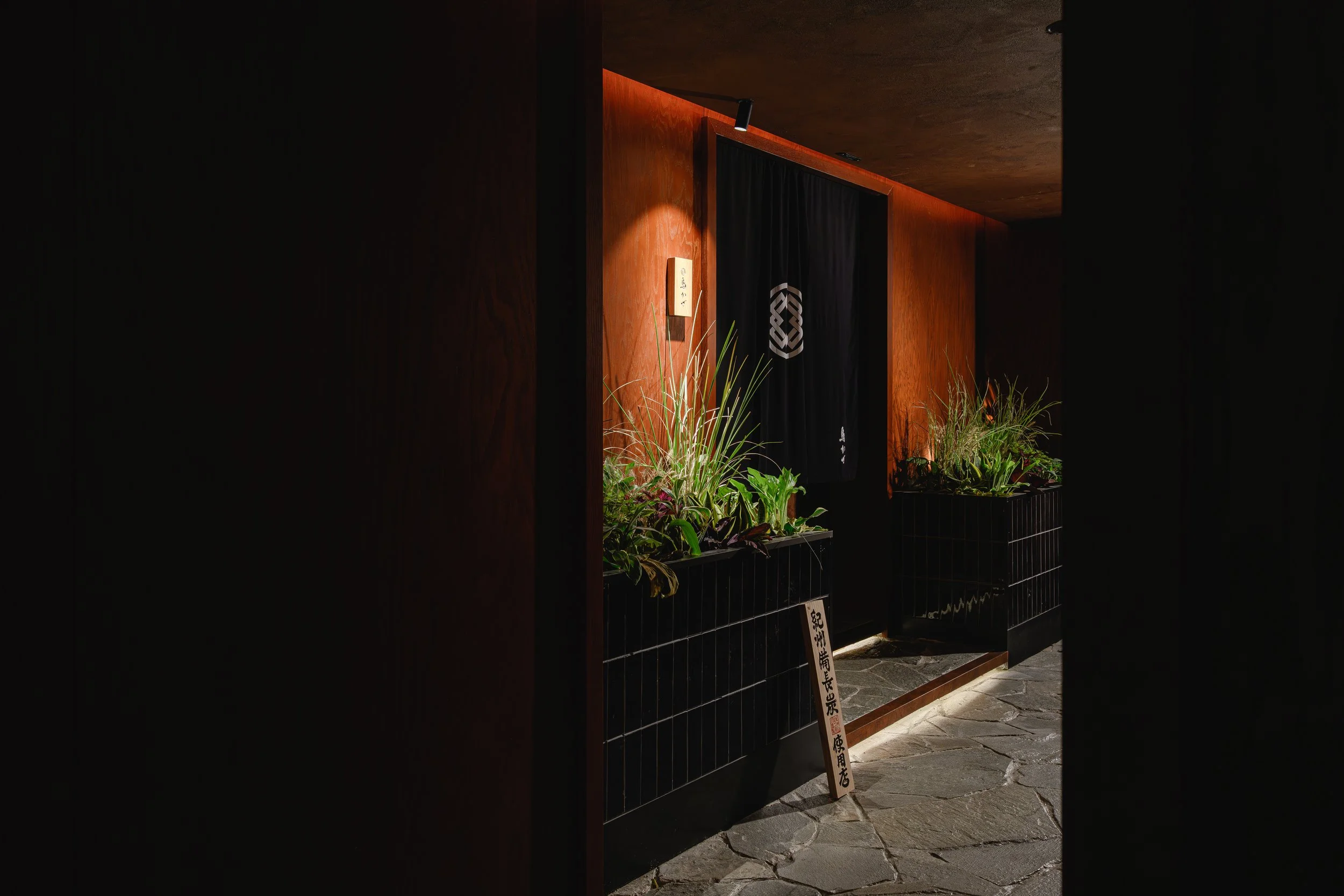 Torikaze centres the dining experience on the yakitori grill, where a U-shaped counter places guests in direct view of the chef’s precise, disciplined craft. Dark timber surfaces and a low-lit ceiling create an intimate frame, punctuated by a patinated metal canopy that casts a warm glow over the cooking stage. A stone-paved entry corridor with greenery and a noren threshold sets a calm, ritual-like approach, reinforcing the restaurant’s respect for tradition, ingredient, and technique.