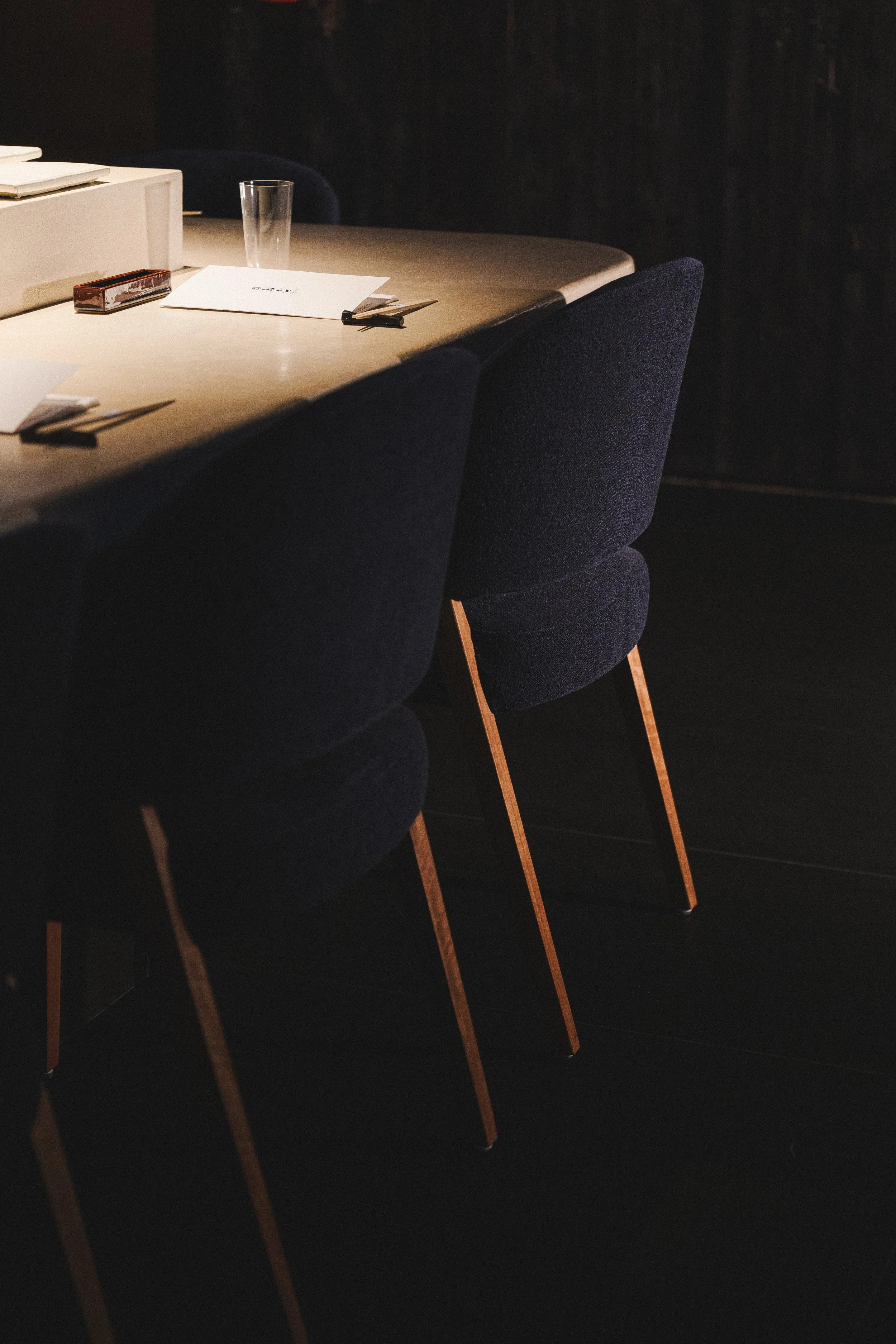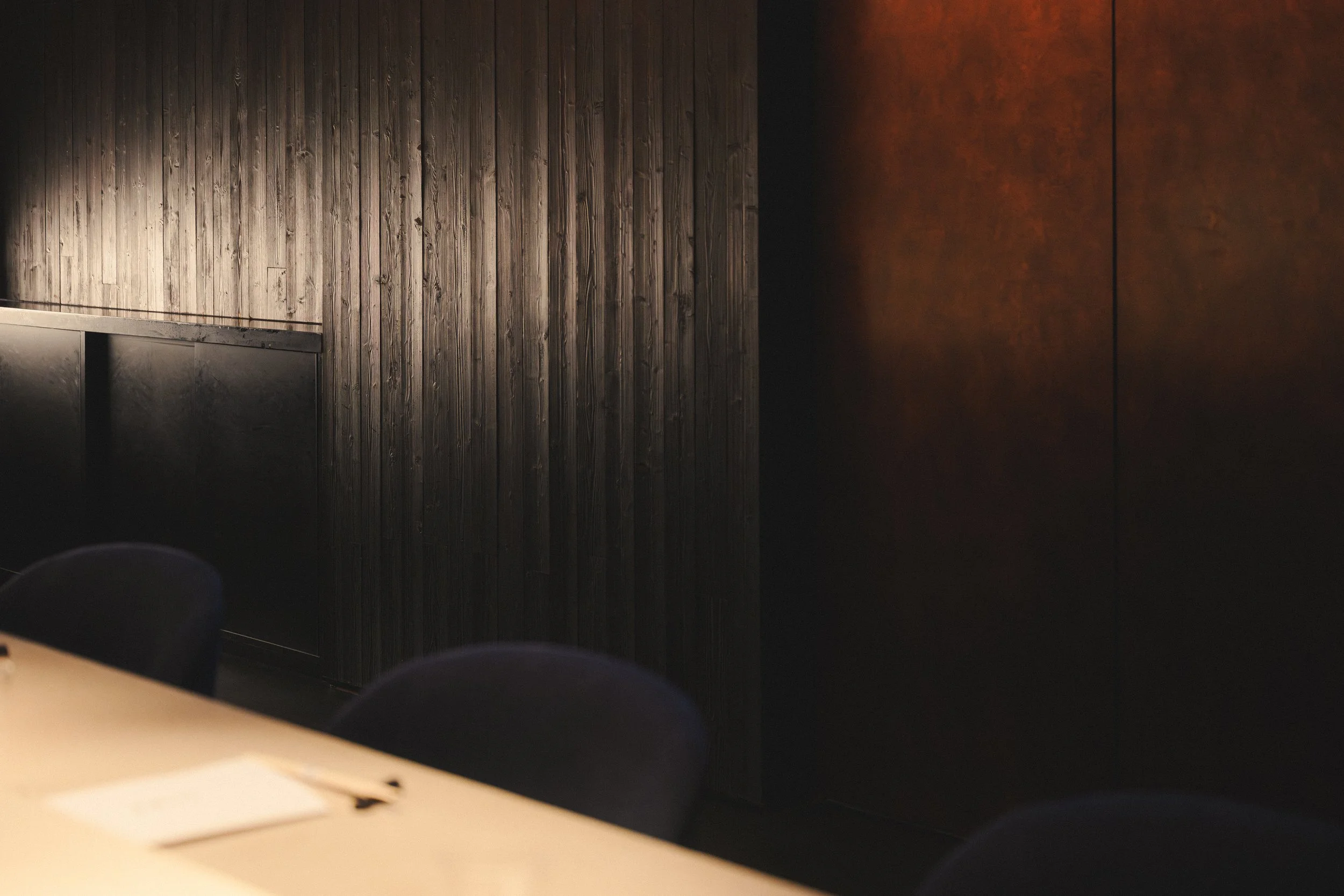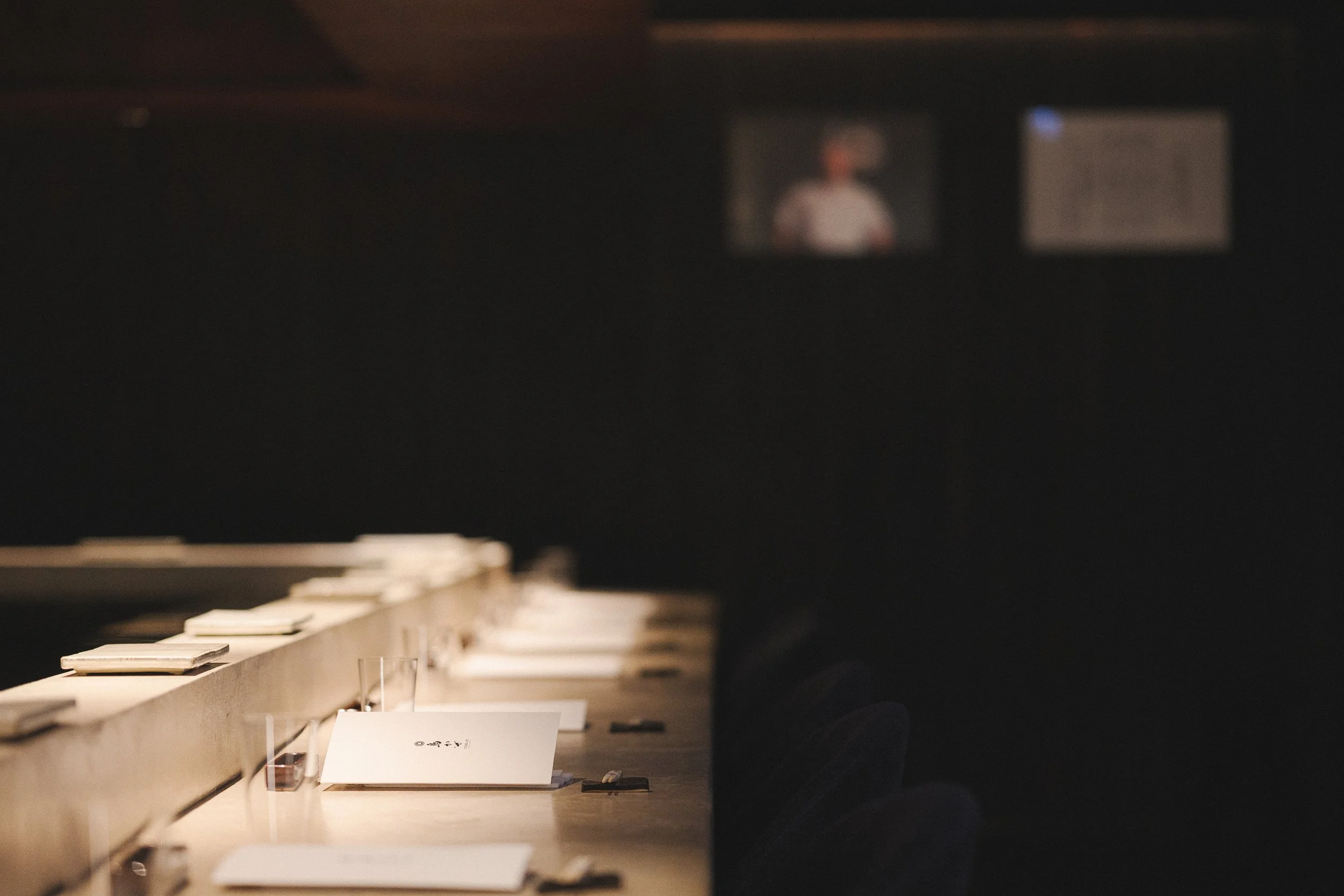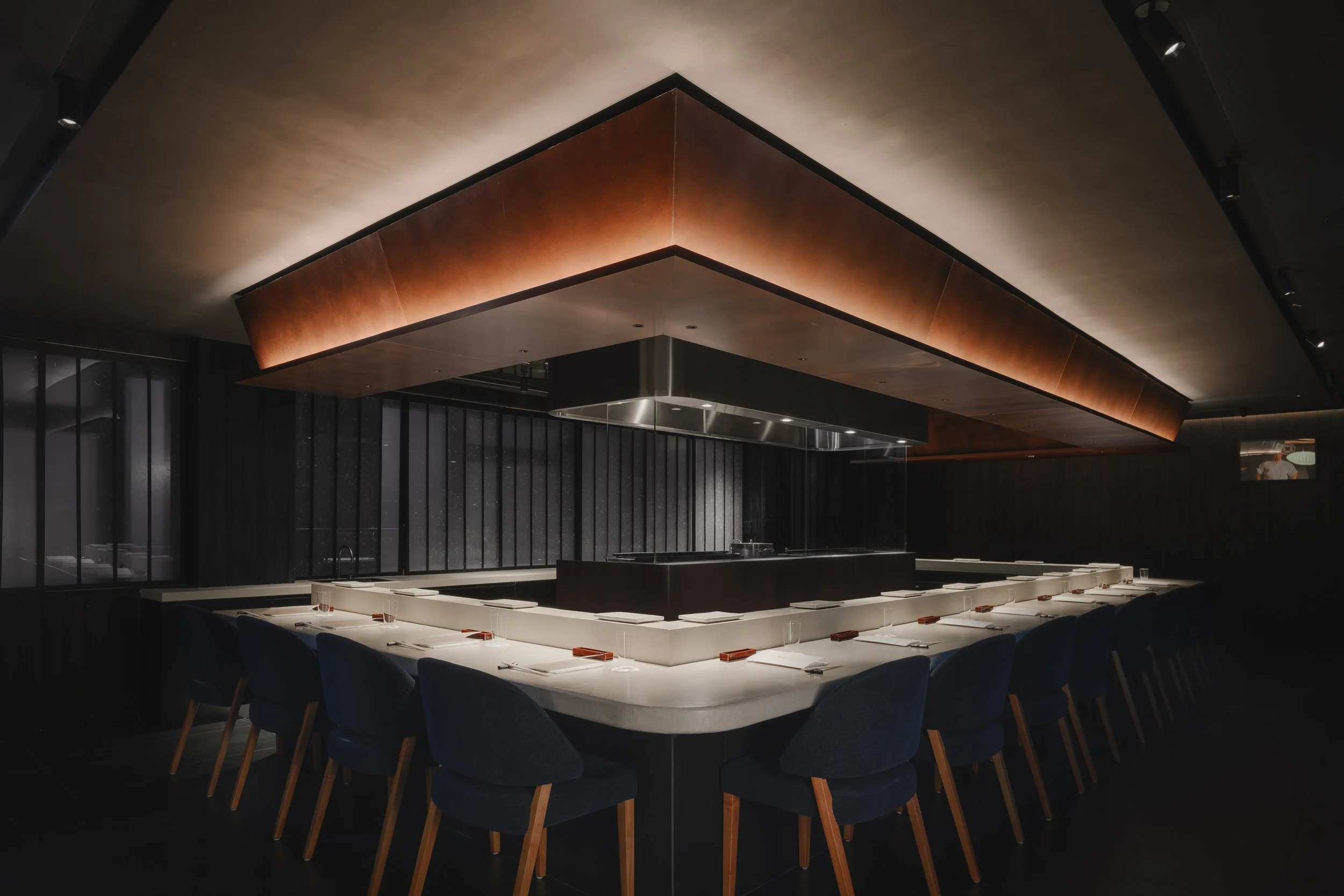 Torikaze centres the dining experience on the yakitori grill, where a U-shaped counter places guests in direct view of the chef’s precise, disciplined craft. Dark timber surfaces and a low-lit ceiling create an intimate frame, punctuated by a patinated metal canopy that casts a warm glow over the cooking stage. A stone-paved entry corridor with greenery and a noren threshold sets a calm, ritual-like approach, reinforcing the restaurant’s respect for tradition, ingredient, and technique.